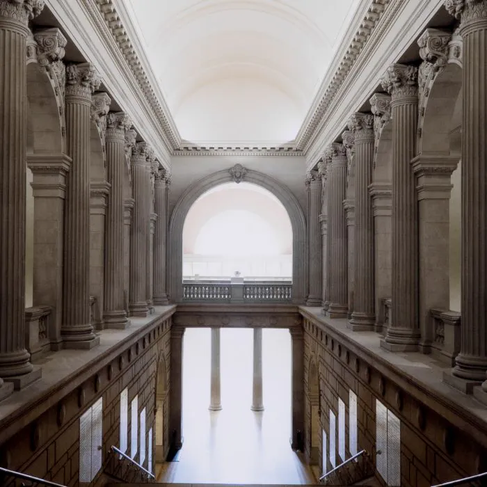 Фотография интерьера (номер 3) — черно-белое изображение, детально иллюстрирующее элегантную архитектуру в стиле бозар фасада и Большого зала Метрополитен-музея на Пятой авеню, открытого для публики в 1902 году. Проект был разработан архитектором Ричардом Моррисом Хантом, который также был одним из учредителей музея. Прекрасно отпечатанное изображение элегантно оформлено в серую деревянную раму со стеклом.