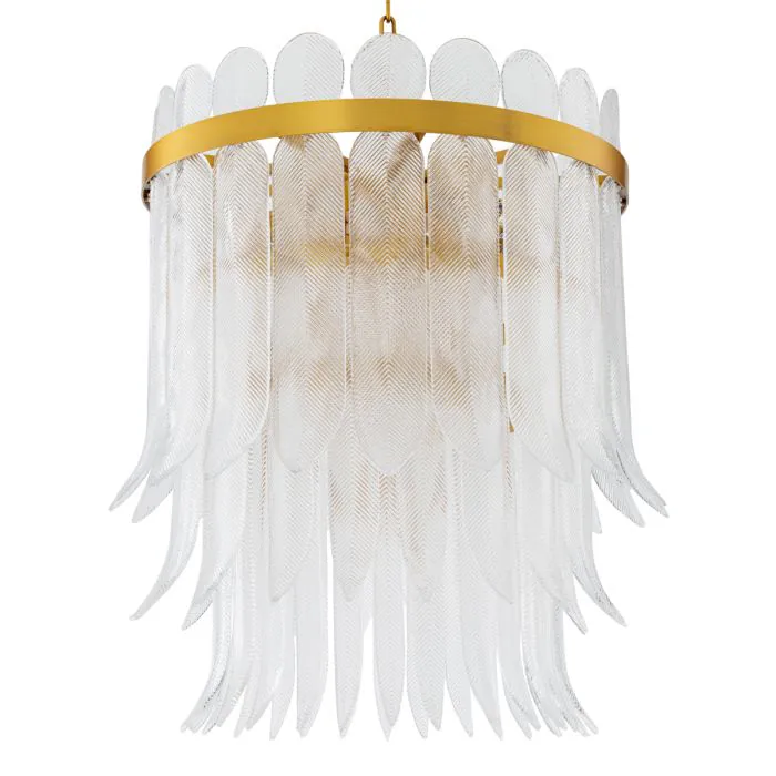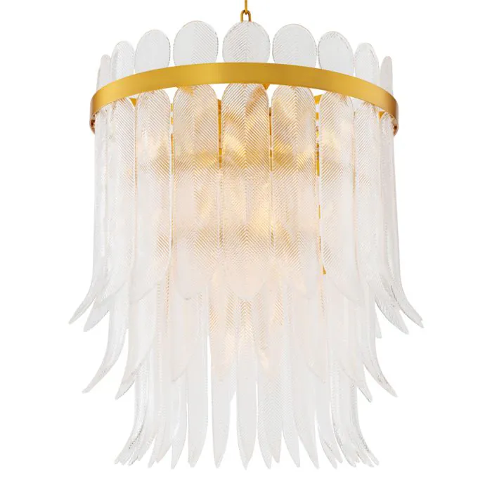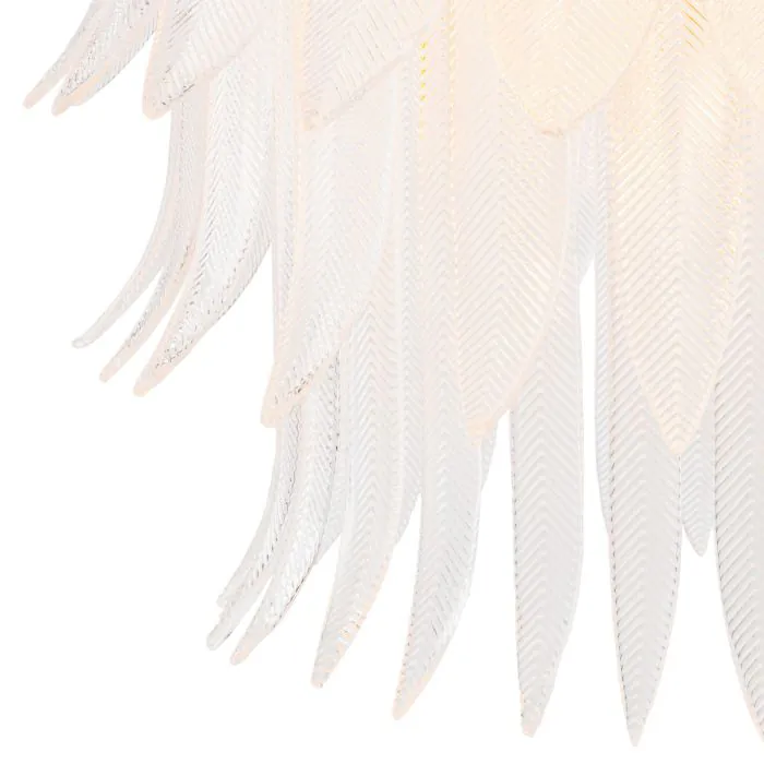 Эта изысканная люстра, напоминающая гламур высокой моды 1920-х годов и элегантность ар-деко, запечатлевает изящество застывшего движения. Каждое отлитое вручную стеклянное «перо» переливается тонким радужным блеском, образуя каскад, напоминающий веера с перьями и украшенные драгоценностями головные уборы вечеринок эпохи флэпперов. Тонкая ребристая текстура, напоминающая изящную вышивку или металлизированную нить, преобразует свет в мягкое, сияющее свечение, роскошное, но в то же время неземное. Силуэт люстры Erika, закрепленный на круглой латунной раме, повторяет форму короны и венца, ненавязчиво подчеркивая ее царственный характер. Ее форма столь же архитектурна, сколь и органична: симметрия сочетается с чувственностью, точность смягчается естественным ритмом стекла, напоминающего перья. В результате получается исследование контрастов: структурированное, но плавное, сияющее, но устойчивое. Светильник Erika кажется одновременно вневременным и кинематографичным, воссоздавая золотую эпоху гламура ар-деко, где дизайн, мода и фантазия переплетались. Он с одинаковым успехом мог бы висеть как в парижском бальном зале, так и в современном салоне, излучая ту же атмосферу роскошной грации. Доступный в виде люстры, подвесного светильника и настенного бра, Erika — это носимое произведение дизайна, сияющая дань уважения женственности, декоративности и вечной красоте.