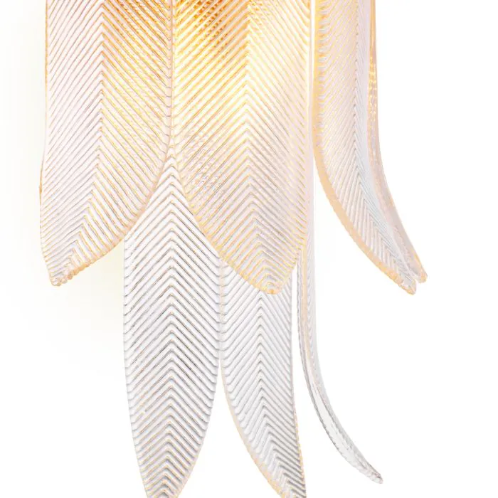 Этот изысканный настенный светильник, напоминающий гламур высокой моды 1920-х годов и элегантность ар-деко, запечатлевает изящество застывшего движения. Каждое отлитое вручную стеклянное «перо» переливается тонким радужным блеском, образуя каскад, напоминающий веера с перьями и украшенные драгоценностями головные уборы вечеринок эпохи флэпперов. Тонкая ребристая текстура, напоминающая изящную вышивку или металлизированную нить, преобразует свет в мягкое, сияющее свечение, роскошное, но в то же время неземное. Силуэт светильника Erika, закрепленный на круглой латунной раме, повторяет одновременно корону и венец, ненавязчиво подчеркивая его царственный характер. Его форма столь же архитектурна, сколь и органична: симметрия сочетается с чувственностью, точность смягчается естественным ритмом стекла, напоминающего перья. В результате получается исследование контрастов: структурированный, но плавный, светящийся, но устойчивый. Светильник Erika кажется одновременно вневременным и кинематографичным, воссоздавая золотую эпоху гламура ар-деко, где дизайн, мода и фантазия переплетались. Он с одинаковым успехом мог бы висеть как в парижском бальном зале, так и в современном салоне, излучая ту же атмосферу роскошной грации. Доступный в виде люстры, подвесного светильника и настенного бра, Erika — это носимое произведение дизайна, сияющая дань уважения женственности, декоративности и вечной красоте.