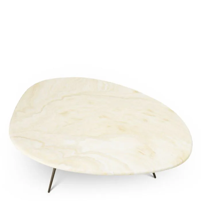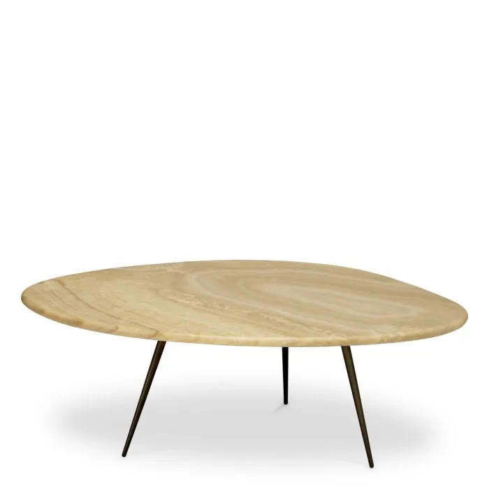 Кофейный столик Portofino с органично изогнутой столешницей из оникса и тонкими, сужающимися к низу ножками сочетает в себе природную элегантность и современный минимализм.